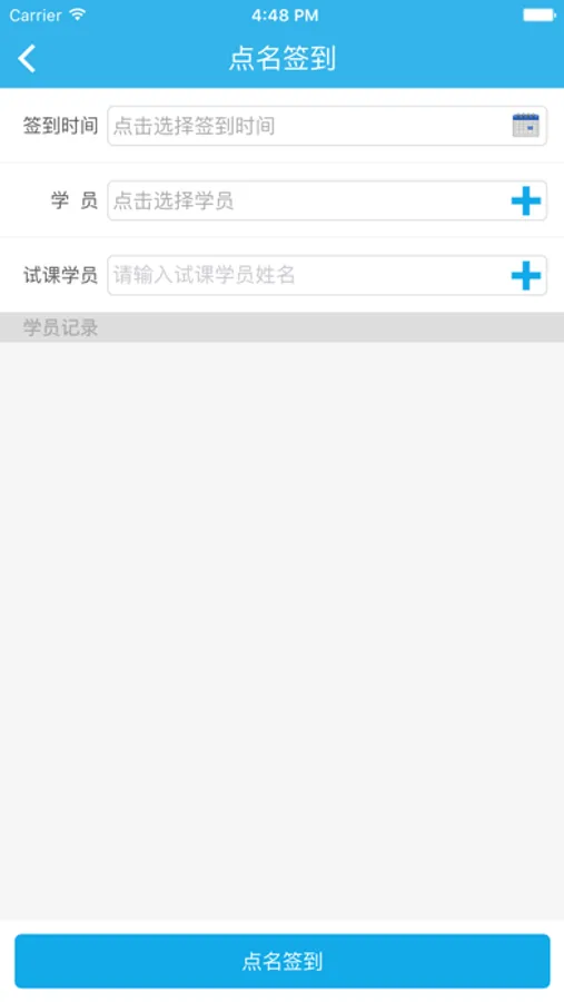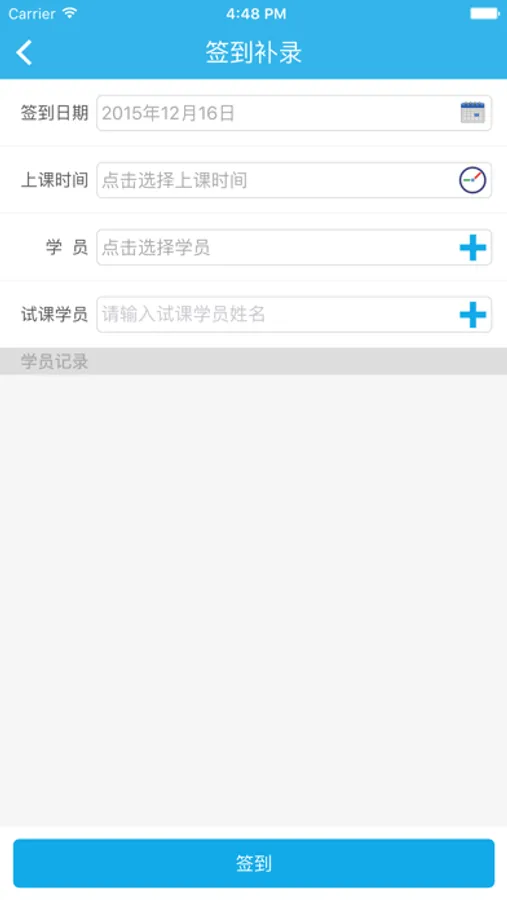 教练可以通过app查询自己的上课考勤记录,为学员进行点名签到和签到补录功能,每次签到后会在消息中心里面收到一条签到成功的消息通知。