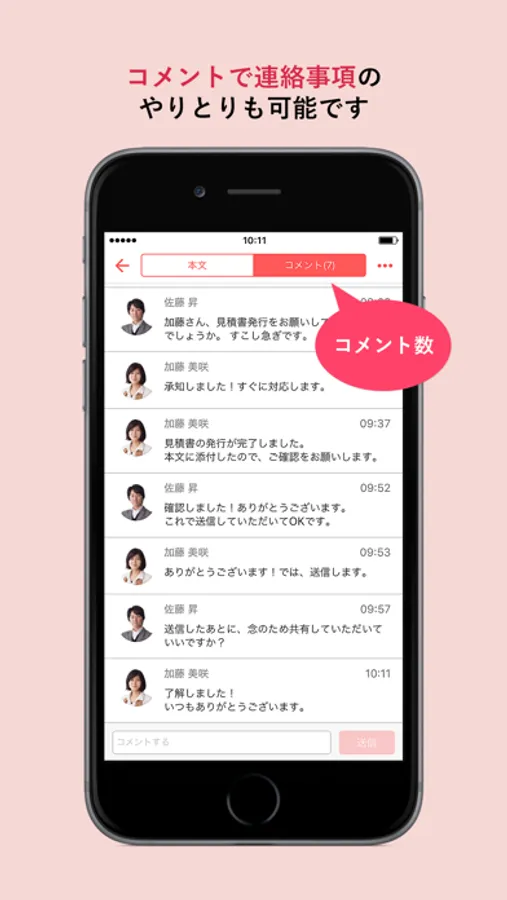新着メール受信などがプッシュ通知で届き、受信したメールにコメントを書き込んだり、返信することもできます。