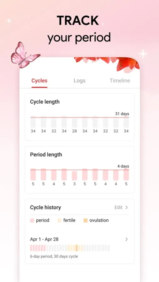 - menstrual cycles list - add & adjust past or current cycles and visualize lengths to help track period irregularities.
