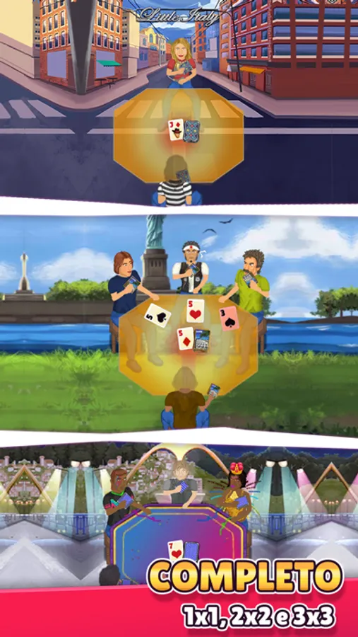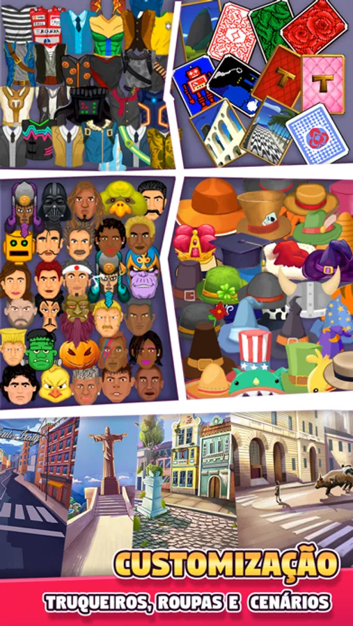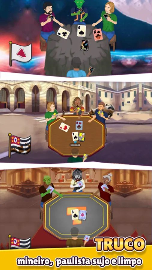 Brasileiro de verdade joga truco raiz! Aqui tem Truco na Cidade, Truco no Campo, Truco na Roça, Truco até nos Estados Unidos!! Jogue Truco nos Cenários mais Animados, Inusitados e Divertidos do mundo inteiro! E não só desse mundo... aqui você joga truco até na Lua e em outros planetas!