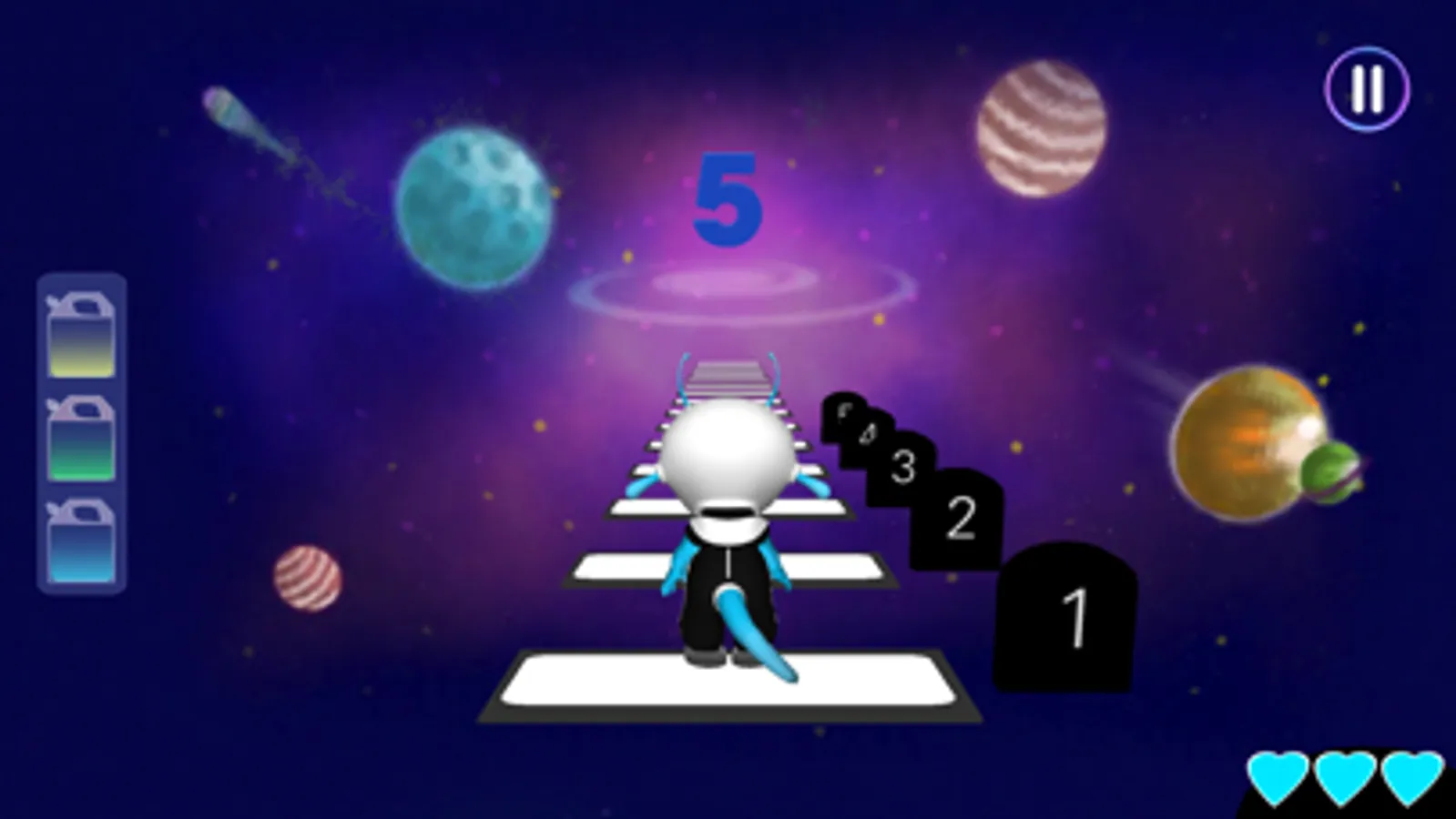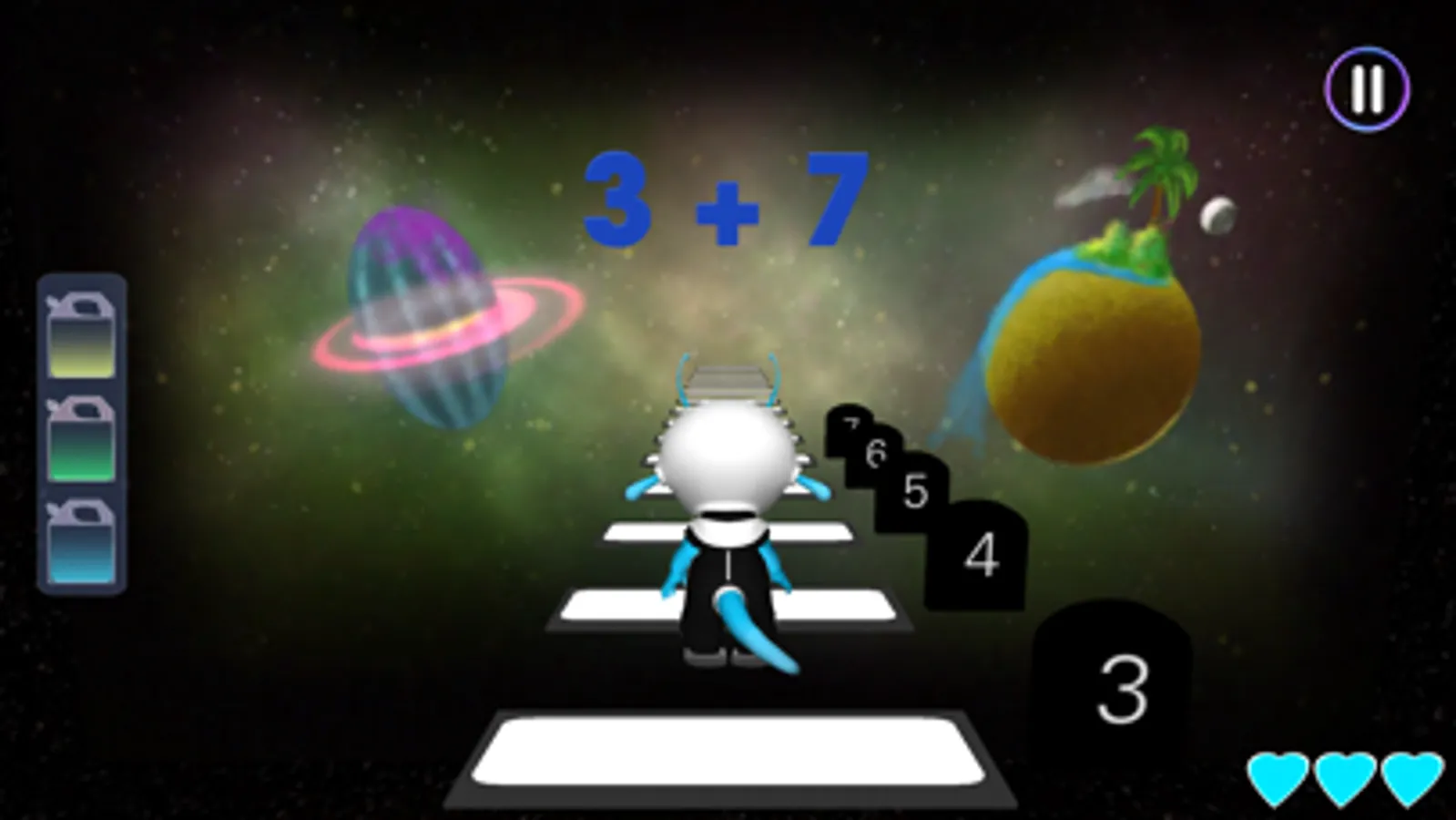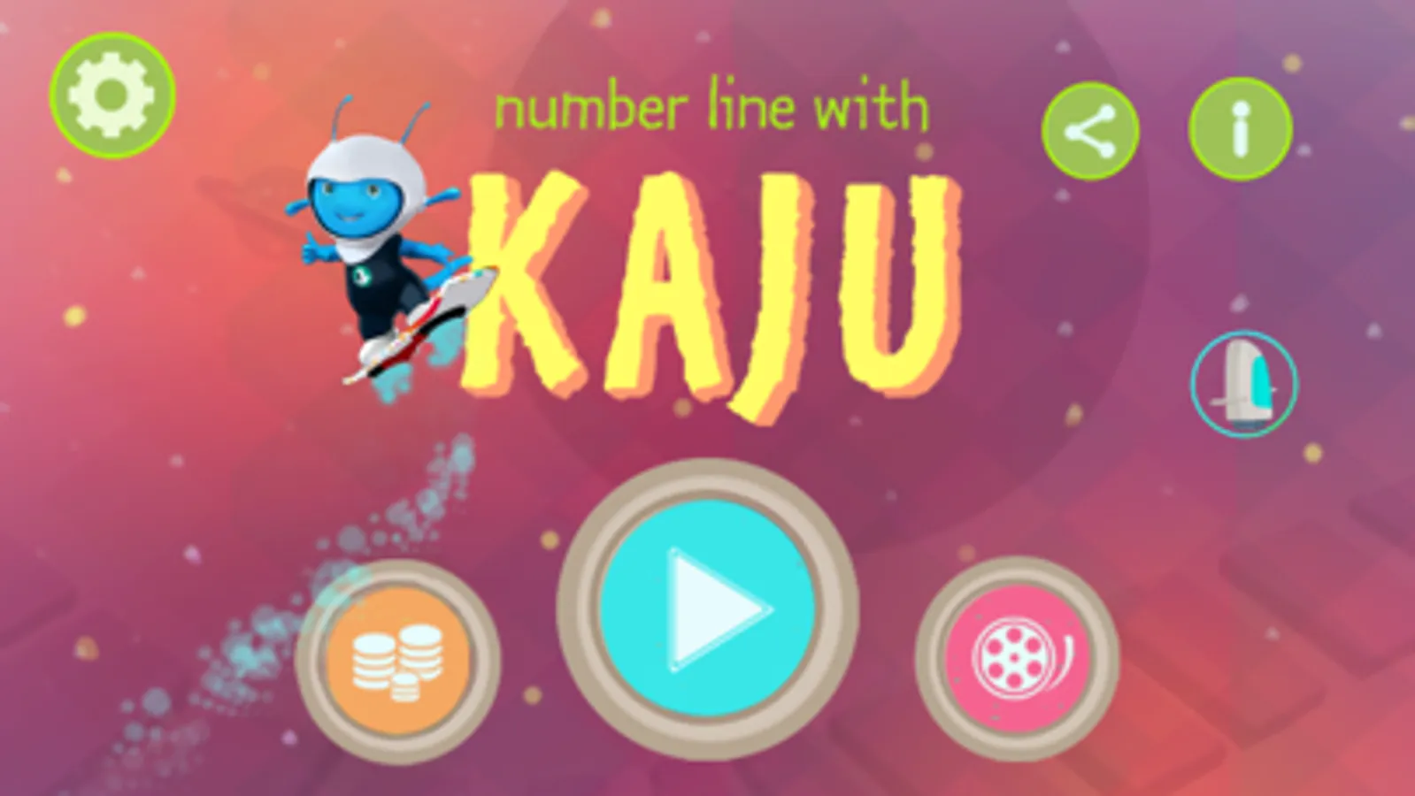 This app for kids starts with a story about our lovable baby alien, Kaju, who has an accident in space because he didn't wear his seat belt! He must now go through the space number line, collecting all his spaceship parts to rebuild it. Children help him do that by helping him jump to the right number and finding all the necessary parts and fuel!