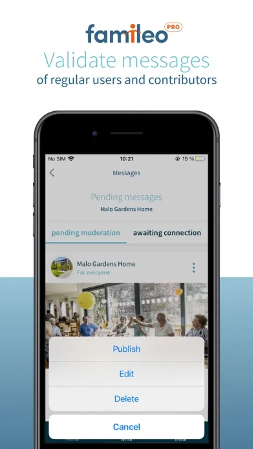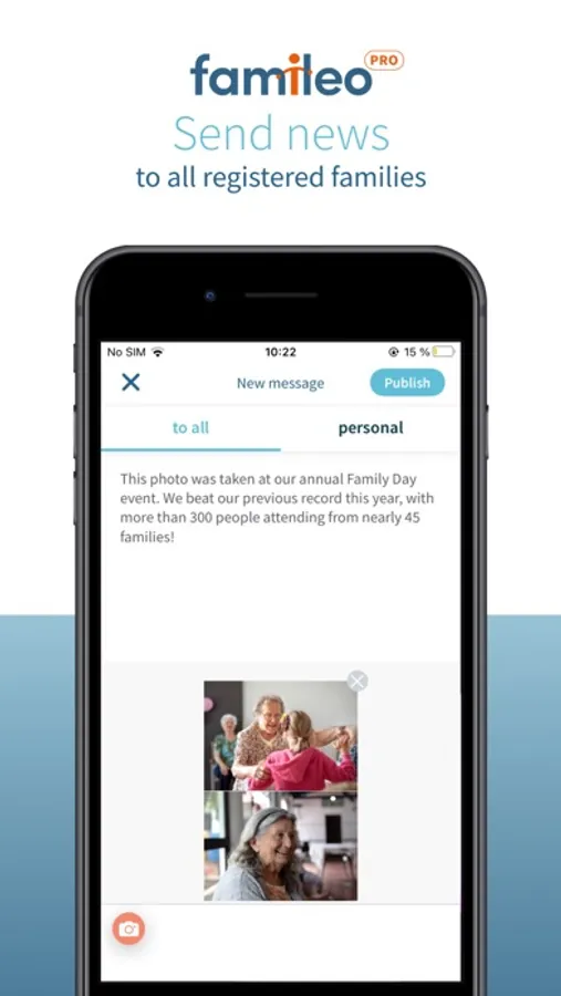 The FamileoPro app allows you to easily send messages to your residents’ families’ Famileo accounts as well as consult information about the residents or your care setting. As is the case with our web interface, several roles are available on the app (administrator, regular user, contributor).