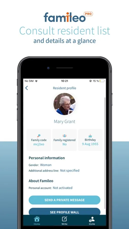 You can consult the list of your active or deactivated residents and each resident profile. You will also be able to access family codes so you can easily communicate them to the family concerned. You will not be able to change residents profiles in the app for the time being.