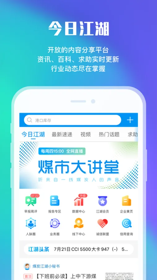 “煤炭江湖”是中国煤炭流通领域基于行业社群的煤炭供应链智慧服务平台,也是首个基于内容和社交服务的分享、互助式云社群。它链接行业内最活跃的群体和个人,集众人智慧为众人服务,可以为会员提供最全面、最真实、最及时、最精确的知识、信息、经验和业务机会;并透过内容实现人与人的交互,持续产生和沉淀高质量的业务数据和煤炭人行为数据,形成社群生态;围绕社群生态,依托流量、数据和人工智能,精准匹配人(企业)与资讯、数据和业务机会,基于场景赋能,为煤炭流通相关企业提供专业的供应链服务。