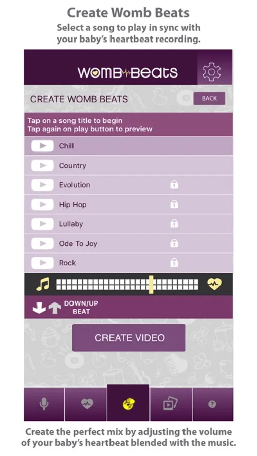 · Uses your baby’s fetal heartbeat as the "pulse" to a song (your Womb Beats) by looping a portion of the recorded heartbeat and syncing selected music to play along at the same speed.