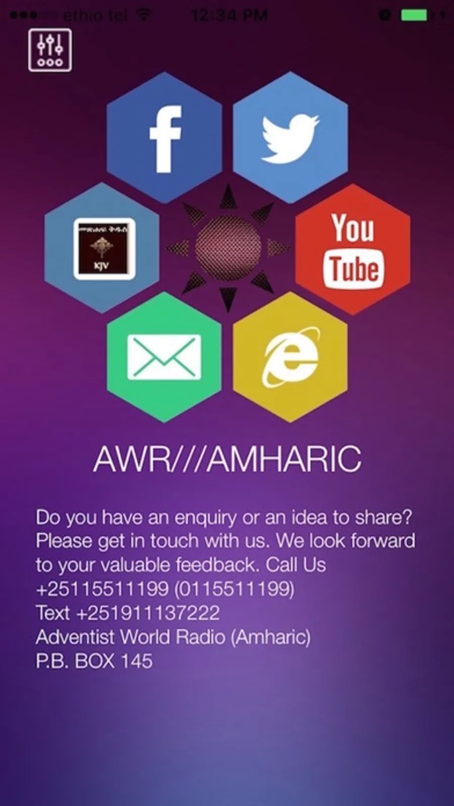 "Broadcasting the Adventist hope in Christ to the hardest-to-reach people groups of the world in their own languages.” listen to your favorite Adventist World Radio (AWR Amharic Radio, Ethiopian) streaming to your phone! Now You can access and enjoy AWR Amharic Podcast Radio. This app lets you listen to the amazing Gospel of Jesus which is streamed to you from the AWR Amharic Podcast. Now listen to the Bible radio in audio format. “This gospel of the kingdom will be preached in all the world...Mat 24:14” Enjoy!