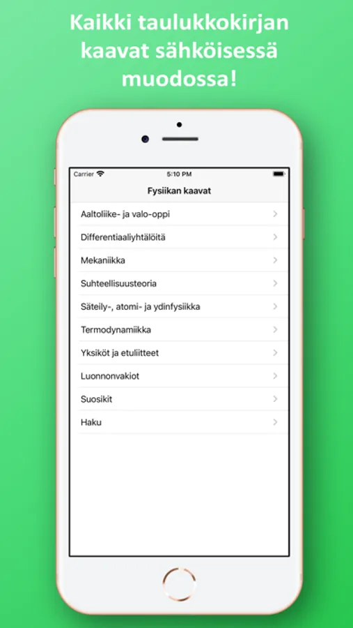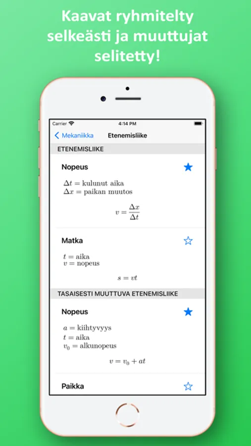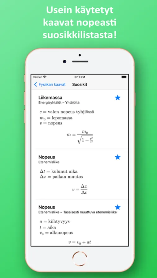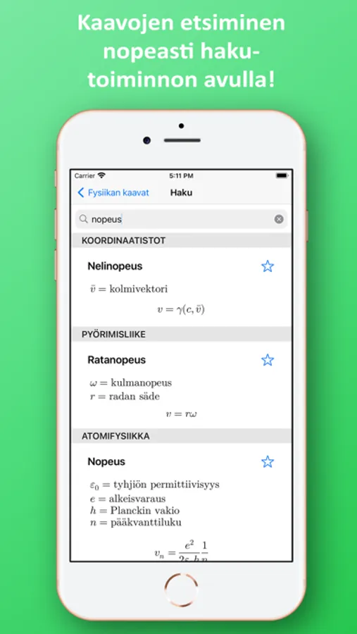 Sovelluksessa on kätevä hakutoiminto, jonka avulla löydät tarvittavan kaavan helposti ja nopeasti. Lisäksi voit merkitä käytetyimmät kaavat suosikeiksi, jolloin ne löytyvät kätevästi yhden valikon alta.