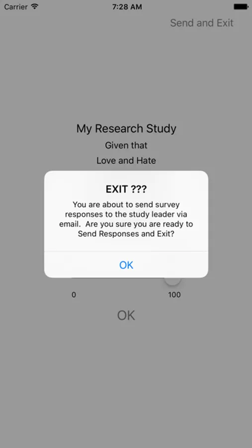 When the user is done filling out the survey, the user selects 'Exit and Send' and the data that was collected by the App is delivered to the social scientist as a list of pairs of concepts and the differences (or distances) between them.
