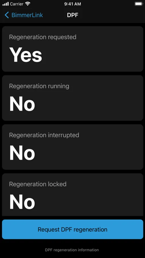 BimmerLink allows you to check the current state of the diesel particulate filter in your car. Find out when the last regeneration took place or how much ash has accumulated in the filter and start a regeneration with the touch of a button.