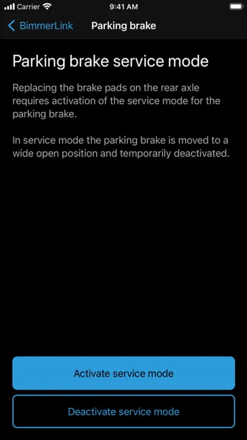 BimmerLink allows you to activate the service mode for the electromechanical parking brake.