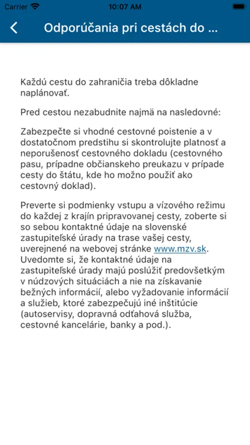 Aplikácia prináša tipy, ako postupovať v prípade núdze v zahraničí a možno ju použiť na uloženie fotografií cestovných dokumentov pre prípad krádeže alebo straty dokladov.