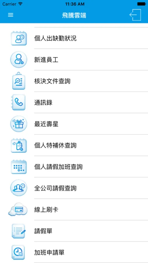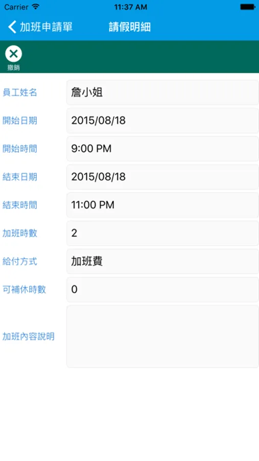 2. 請假加班申請:使用者透過APP進行線上請假與加班的申請,申請同時可上傳附件。
