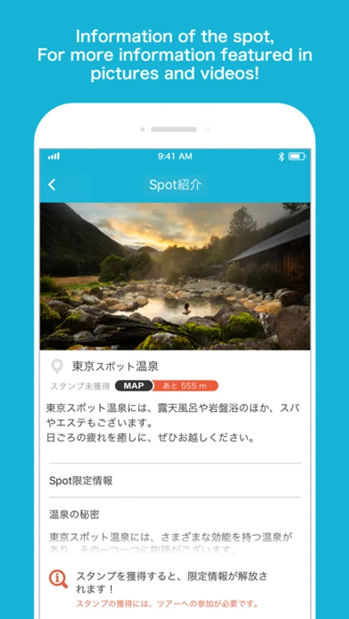 Navigation to the site, digital stamps, and information (limited information) that will be released when you go to the site can be displayed, and the history of the date and time of visiting the tourist spot is recorded as a "tour card", and a photo book It is also possible to produce.