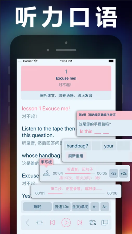 4、睡眠功能、倍速播放、中英译文显示。