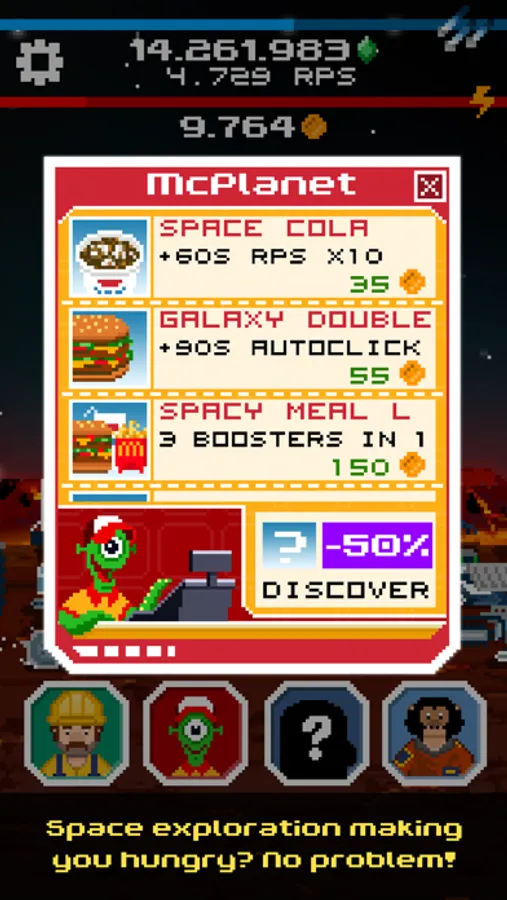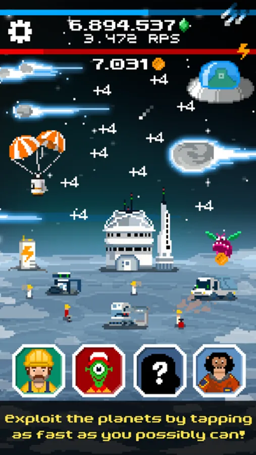 The game starts on a small, moon-like planet that you can tap on to collect resources. You can then spend what you've found on new miners, machines and boosts– and that's just the beginning! With the help of Colonel Flint (who's much more than an ordinary chimpanzee), you can explore your Galaxy and search for new resources to mine! Reach the farthest corners of the universe by buying space probes and leveling them up. The galaxy is yours to explore!