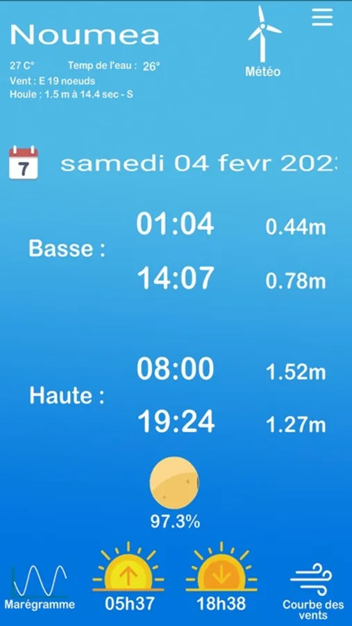 Find out about the time of the tides on a dozen ports in New Caledonia, as well as the schedules of the sunset / sunrise, the weather, the lunar calendar, the wind and the swell.