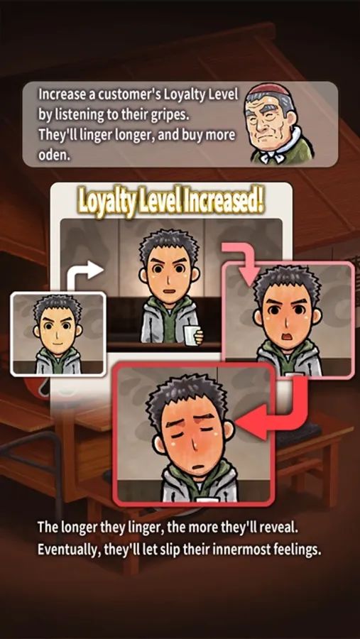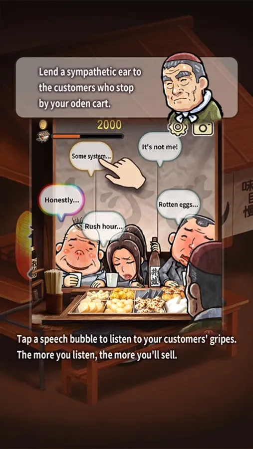 ・Tap or swipe the customers' gripes to listen to them. They'll feel better, and you'll sell more oden. Win-win!