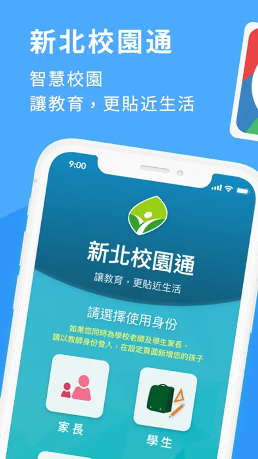 家長:教育放送臺、學校查詢、午餐查詢、學生出缺席、獎懲、課表、借閱紀錄、成績查詢、學生請假功能、親師生平台、新北學BAR等功能。