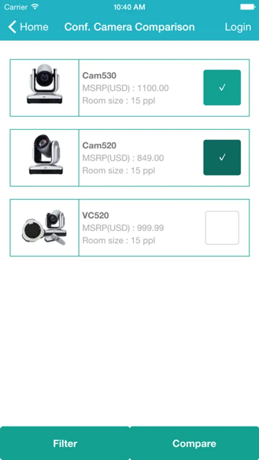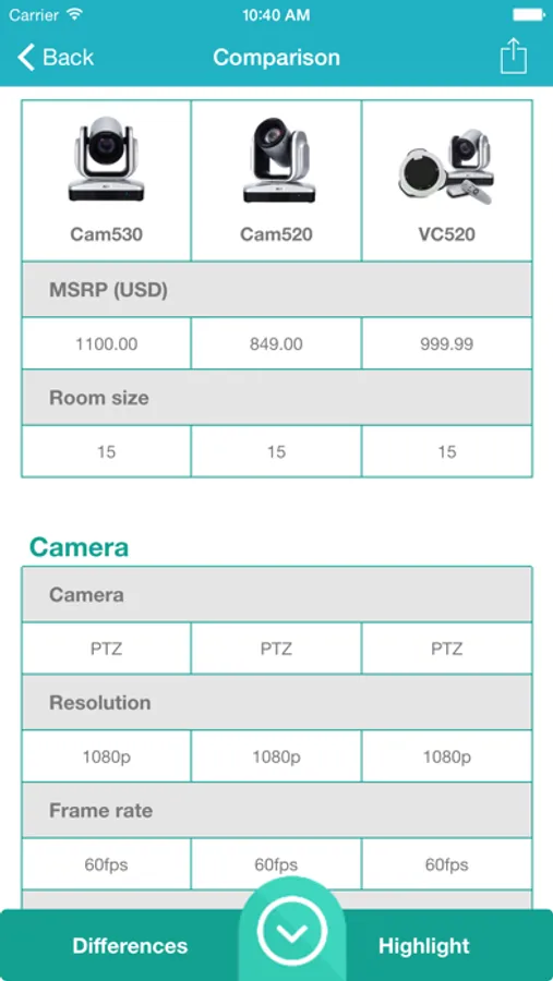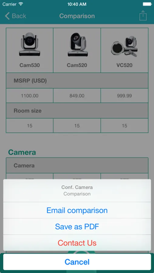 The AVer Comparison App helps you compare a variety of different conference cameras. Cameras are compared on tables that can be saved as PDF files or shared via email. The app can be used while either on or offline. If you are an AVer employee you can log in using your employee number.