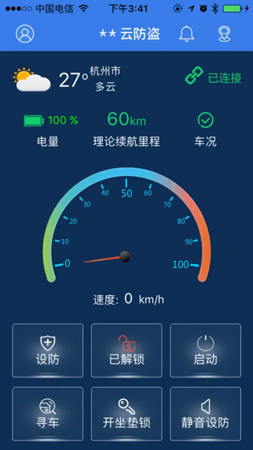 主页模块中,你可以了解到电动车的码数以及电量等信息,并且可以控制报警器。