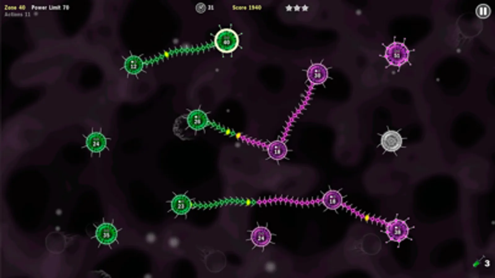 You can cure the organism by capturing enemy cells. To do this, draw a line between green antibody and red enemy cells. This will launch DNA tentacles which drain energy from enemy cell cores and eventually overtake them. Keep an eye on your energy supply and boost your attacks by cutting the tentacles. Capture all enemy cells to secure a zone. Cure all zones and the life form will survive…