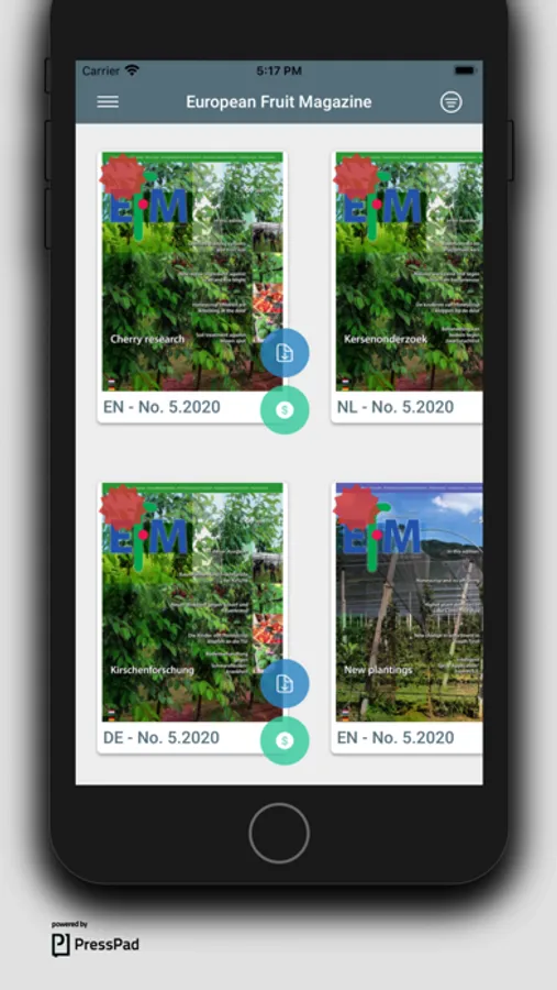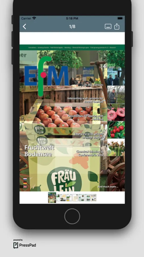 The European Fruitgrowers Magazine (EFM), the magazine for the professional fruit grower, is compiled by an international team of experienced specialists. The magazine is published in German, Dutch and English every month. EFM contains news, background articles and information for top fruit growers (apples, pears, plums, cherries, etc).