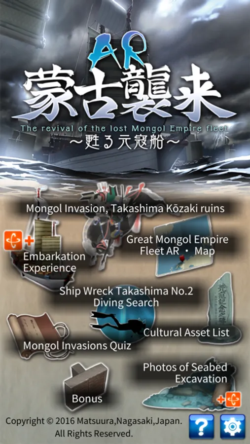 "AR Mongol Invasion" is an application that you can experience overlooking the world's largest "Mongol Empire feet of the Mongol invasions" from various places in Matsuura City, Nagasaki Prefecture using AR(augmented reality) and VR. You also can get information of "underwater ruins" Takashima Kōzaki Site and cultural property in Matsuura City. Why don't you install this application and enjoy the history of Matsuura City in the 13th century.