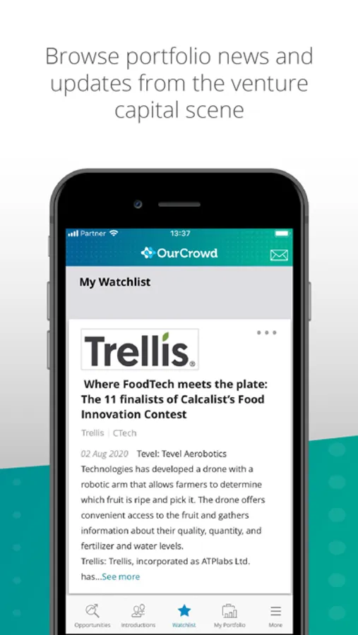 The OurCrowd App is your venture capital investing experience - anytime, anywhere. Get notified when new investment opportunities become available, and access due diligence material in one click. Browse the curated startups, make investments, and review the status of your portfolio, all with the convenience of your smartphone.