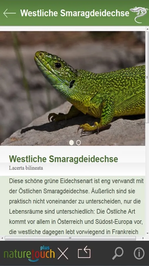 Eidechsen, Schlangen, Schildkröten und Co. Mitteleuropas bestimmen. Ein Tierführer von naturetouch. Naturetouch-Bestimmung: Mit wenigen Klicks zum gesuchten Tier - einfach und für jedermann. Mit ausführlichen Porträts und vielen Fotos. Blindschleiche, Kreuzotter, Zauneidechse, Mauereidechse, Sumpfschildkröte, Zornnatter, Aspisviper, Ringelnatter, Smaragdeidechse, Vipernatter, Waldeidechse, Äskulapnatter, Wiesenotter und andere.