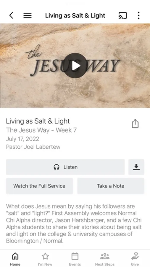 NEW and expanded Platform for media content and connection with First Assembly - Normal, IL. This app will help you stay connected with life at 1AGBN. With this app you can: watch or listen to past messages; stay up to date with notifications; share your favorite messages via Twitter, Facebook, or email; and download messages for offline listening.