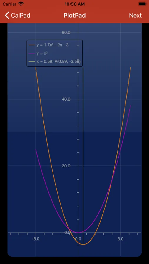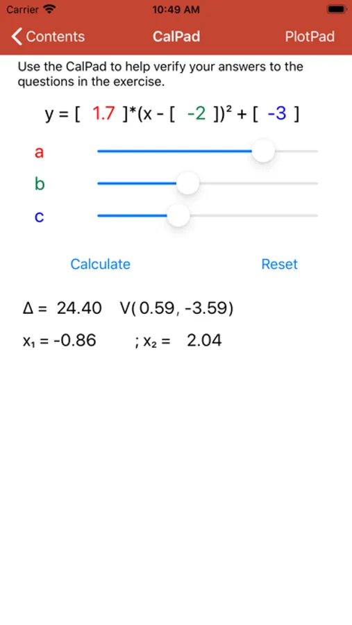 There are formula-specific calculators (CalPad) and parabola plotter (PlotPad) that help students characterize a quadratic function using domain, range, and variations; and visualizing the relative size and shape of the transformed parabola compared to the basic one.