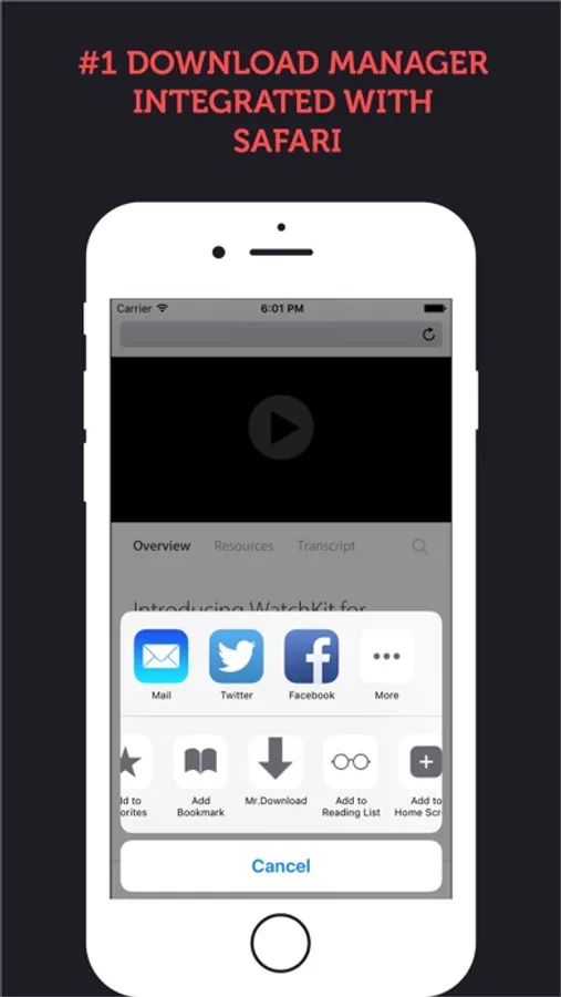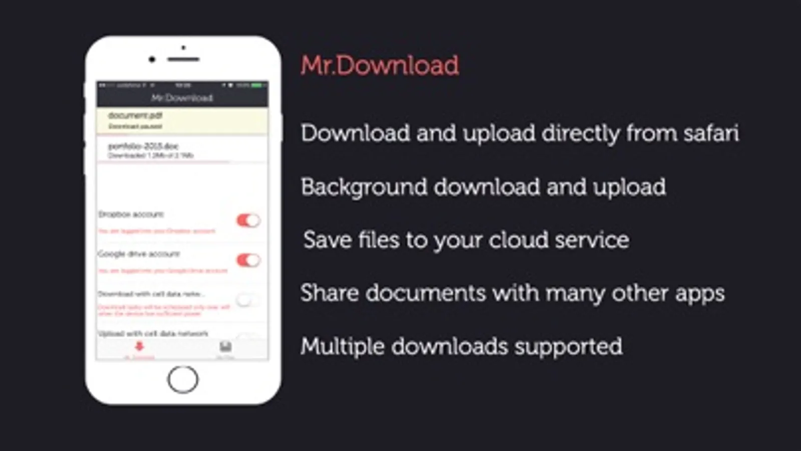 Mr.Download is a fully featured download manager that allows you to download files to your device directly from Safari or many other apps supported.