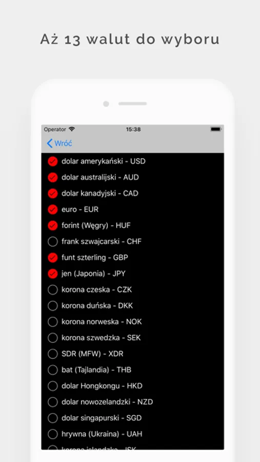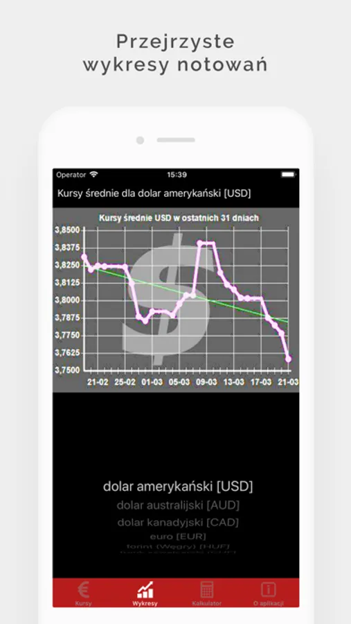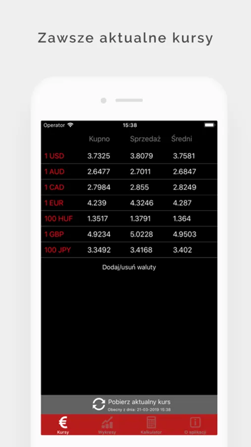 Here you will find the current selling, buying and average exchange rate of the currencies of your choice. You can easily manage the list of your favorite currencies. You can also follow charts with a list of exchange rates.