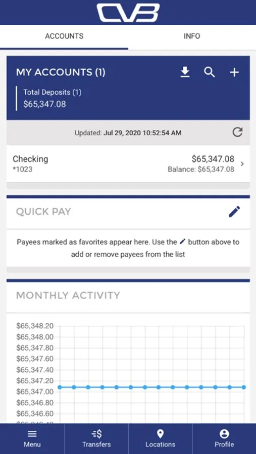 The CVB Mobile Banking App provides you access to your CVB accounts. You can check your balances, transaction history, transfer funds between accounts, pay bills and make deposits conveniently from your smartphone. Using your login information for Online Banking, you can securely access the CVB Mobile Banking App anytime.
