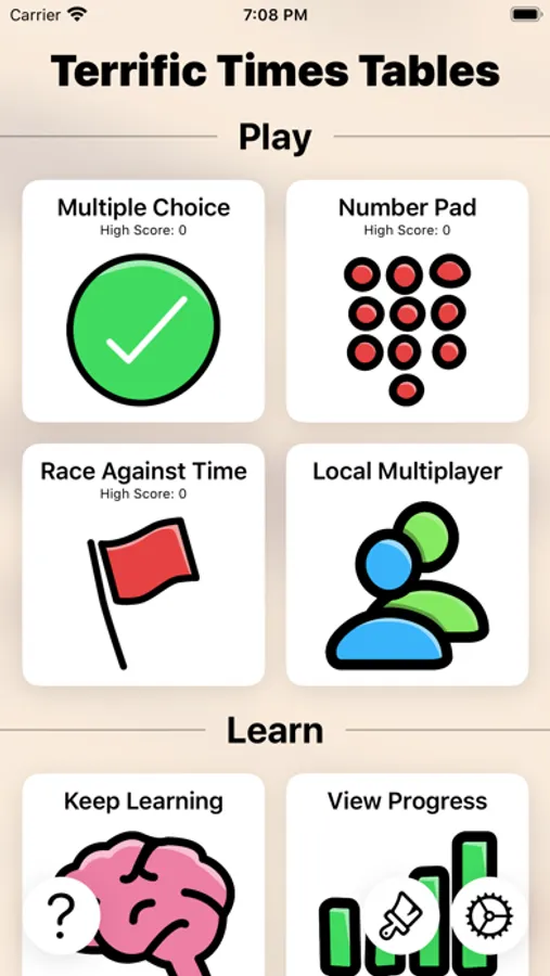 - Five modes (Multiple Choice, Number Pad, Race Against Time, Local Multiplayer, and Learn).