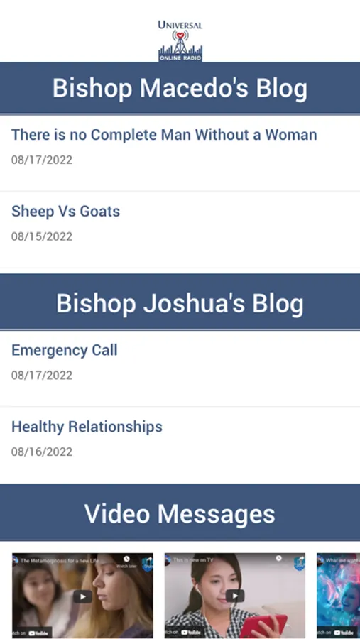 Listen to a word of encouragement and faith before you begin your day, jam to your favorite songs, be inspired by powerful stories of life transformations, and seek guidance and prayer by contacting The Universal Church helpline. All of that in one place: the official application of the Universal Online Radio. Access it now, enjoy it, let it bring color to your daily routine, and share it with your friends. The official app of the 24-hour online radio of The Universal Church—More than a church, a School of Faith.