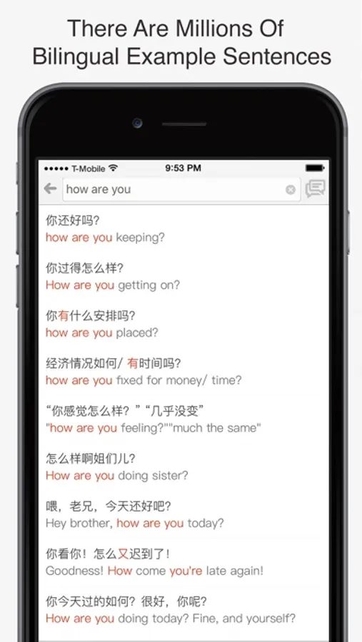 • Look-up for phrases in millions of high quality, hand picked dual-lingual English - Chinese sentences