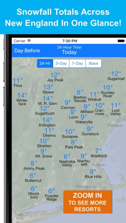 New England Snow Map lets you quickly view and compare snow report information for ski resorts across New England in a single glance by showing the information on a map. With New England Snow Map app, you can: