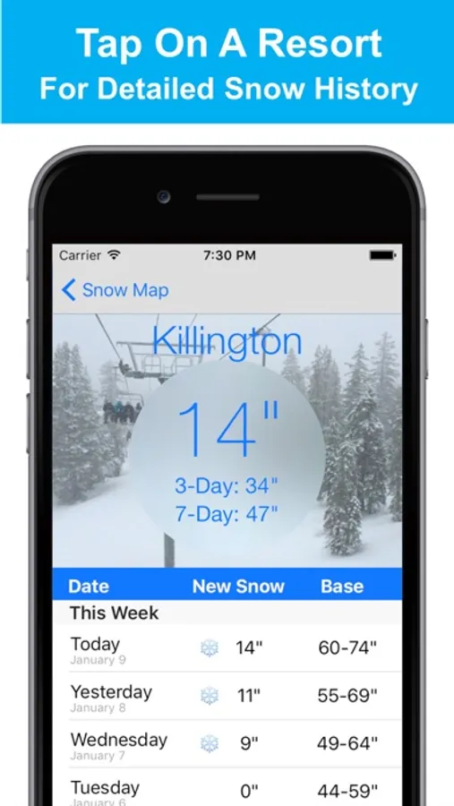 - Review detailed snow history for each resort by clicking on the resort to view the resort-specific page within the app. This lets you see many days of snowfall history.