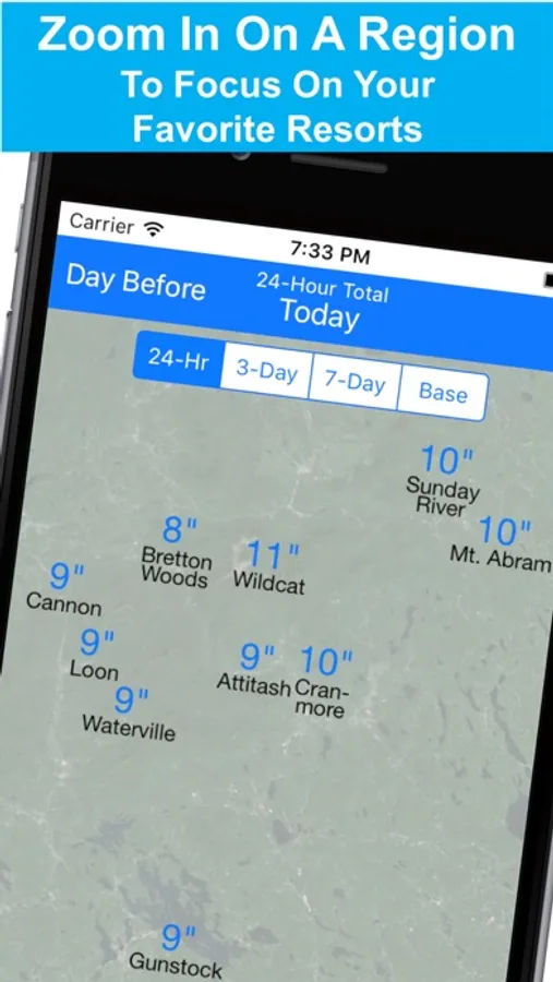 - Zoom in to your favorite part of New England to focus on the resorts you care most about. When you reopen the app, New England Snow Map will take you right back to the region you were last viewing.