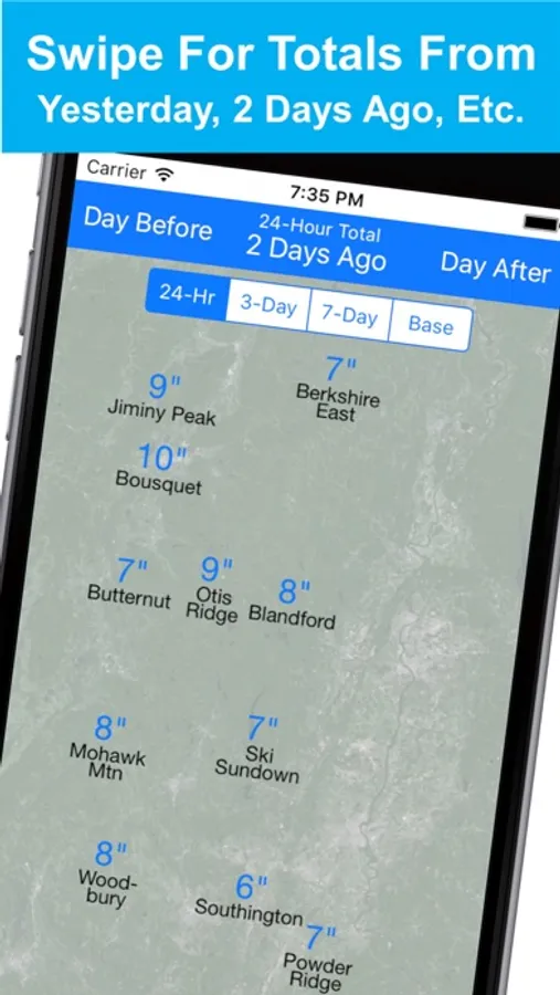 - See the same statistics for past dates by swiping left or right on the map. This lets you see how much snow each resort received yesterday, two days ago, etc.