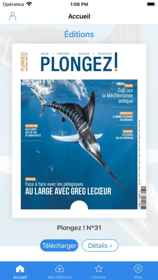 Plongez !, la version numérique du magazine pour les plongeurs, les apnéistes et tous les amoureux de la mer et des océans. Lisez confortablement votre magazine sur smartphone ou tablette et découvrez de nombreux enrichissements : des diaporamas photos, des vidéos exclusives, des témoignages supplémentaires, des liens. Une fois téléchargé, votre magazine est lisible partout où vous allez.