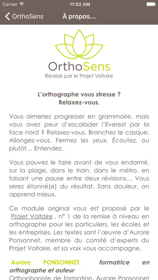 Ce module original vous est proposé par le Projet Voltaire, n° 1 de la remise à niveau en orthographe pour les particuliers, les écoles et les entreprises. Les textes sont l’œuvre d’Aurore Ponsonnet, membre du comité d’experts du Projet Voltaire, et sa voix vous accompagne.
