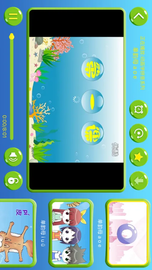 【声像结合】宝宝读拼音,讲究亲子互动智力开发,通过图文和声音组合的动画片生动形象的向宝宝提供学拼音资源,配合亲子互动增加学拼音乐趣。