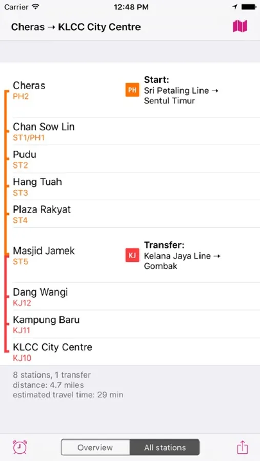 LINES OVERVIEW - shows the order of stations on each line with transit options.