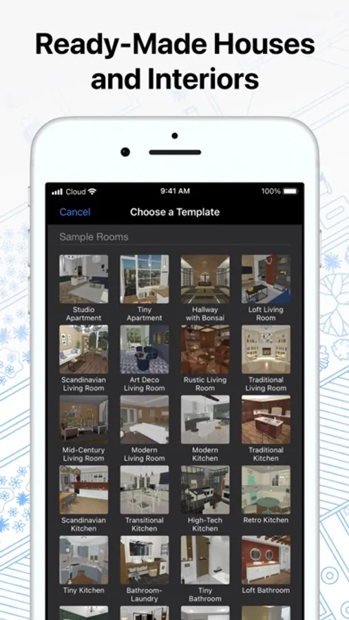 • Hone your design skills with the ready-made house and interior design samples (e.g., kitchens, bathrooms, living rooms, etc).