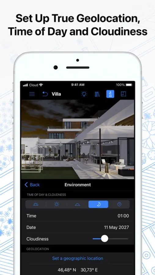 • Achieve natural lighting by setting up true geolocation, time of day and cloudiness.