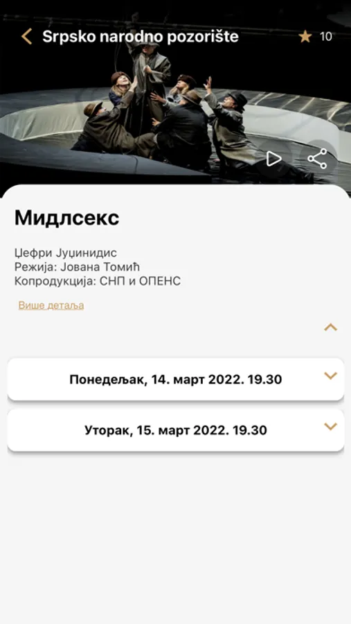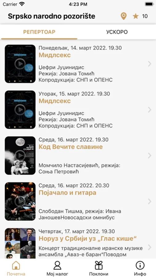 Search through four event list categories: Selected, Repertoire, Coming soon, Special offers