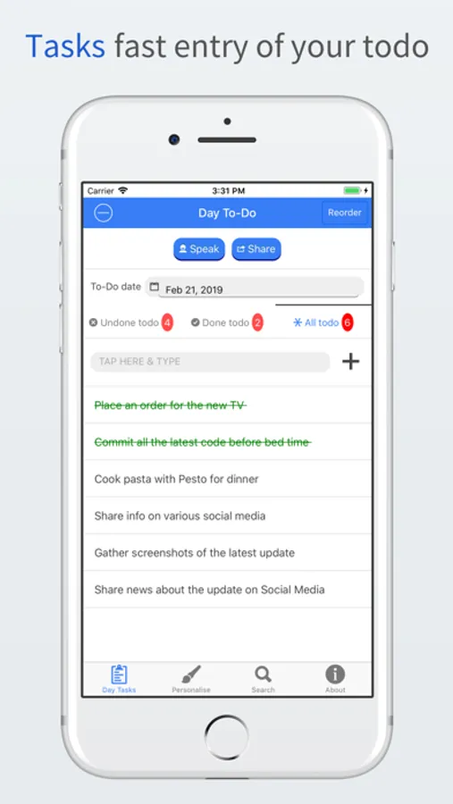 My Day To-Do Lite is a simple to use to-do list app with NO SIGN-UP and FAST TO-DO ENTRY and the following features