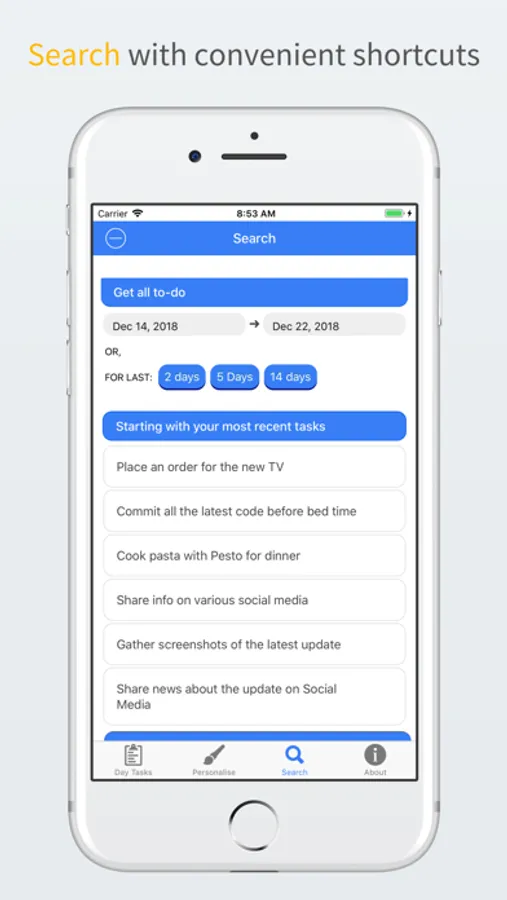 - Search to-do: with convenient shortcuts (e.g. 5, 7 or 14 days)
